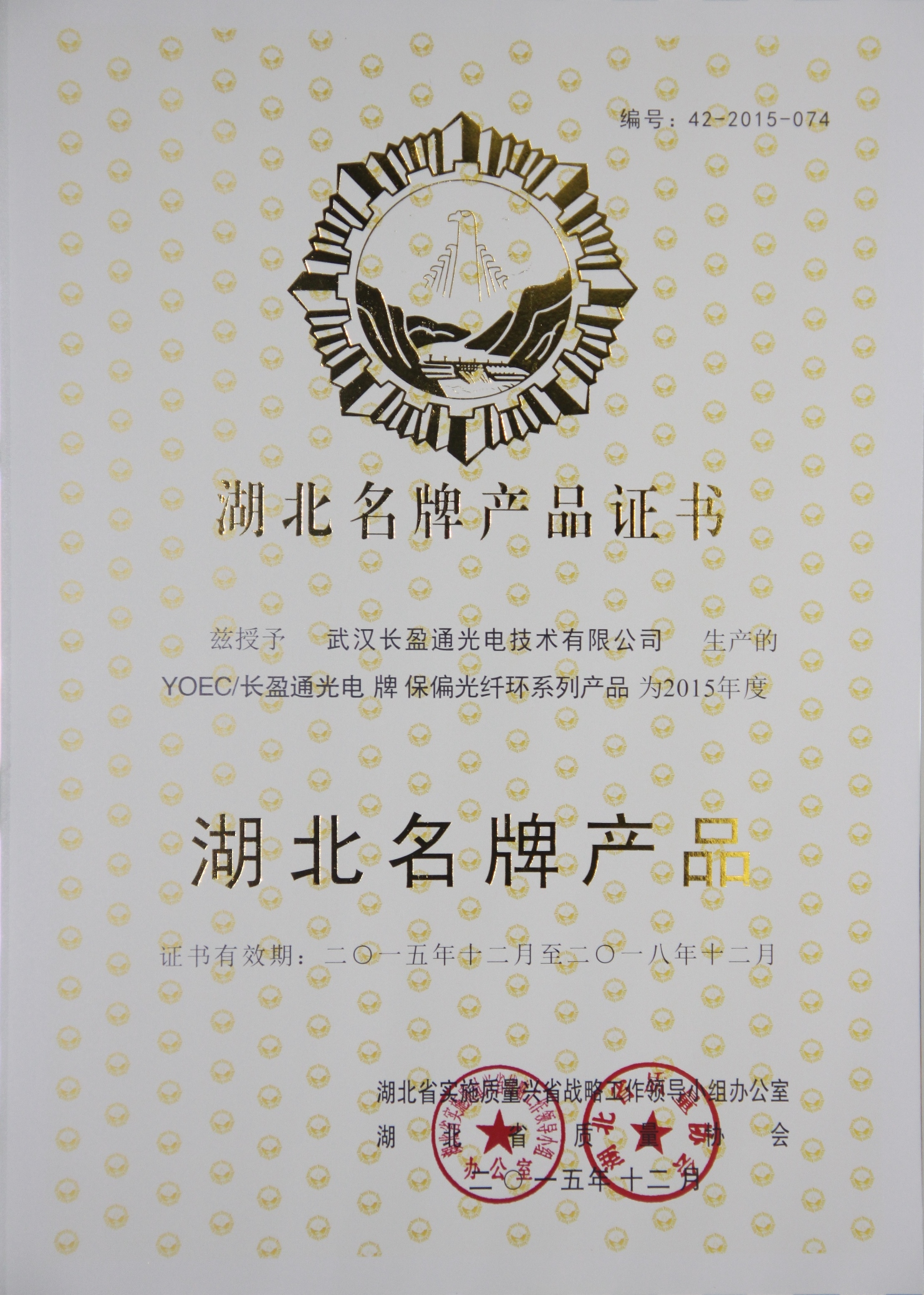 長盈通光電技術(shù)有限公司喜獲”湖北省名牌產(chǎn)品“榮譽(yù)證書