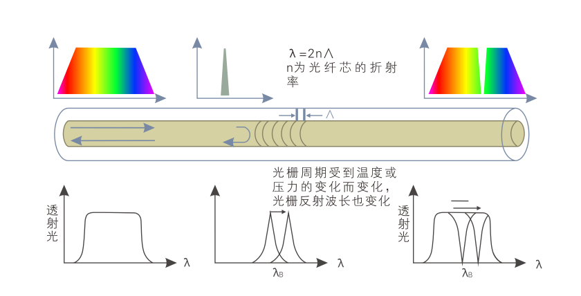 當(dāng)一束寬譜光經(jīng)過光纖光柵時(shí),滿足光纖光柵布拉格條件的波長將產(chǎn)生反射,其余的波長透過光纖光柵繼續(xù)傳輸。溫度的變化會引起光纖光柵的柵距和折射率的變化,從而使光纖光柵的反射和透射譜發(fā)生變化。通過檢測光纖光柵反射譜或透射譜的變化,就可以獲得相應(yīng)的溫度信息。