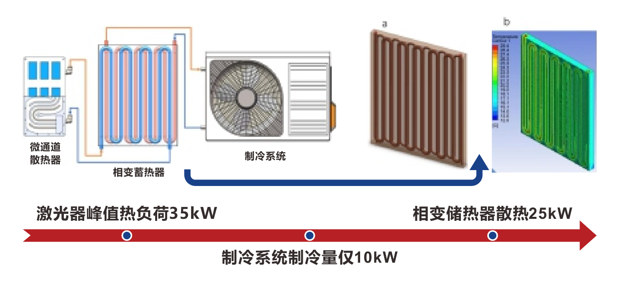 對于激光器等瞬時發(fā)熱功率非常高、工作時間短、準備時間長的設(shè)備,工作時間和準備時間循環(huán)交替進行。由于設(shè)備峰值制冷功率要求高,如采用單一制冷機組,其制冷量極高,機組體積重量過于龐大。