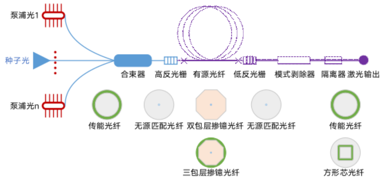 圖1典型光纖激光器結(jié)構(gòu)及相關(guān)激光光纖示意圖