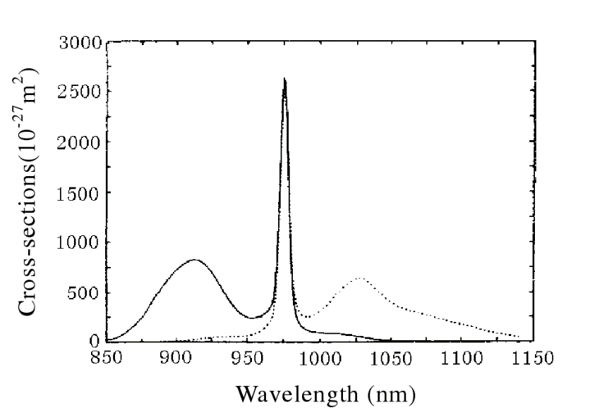 圖3 雙包層摻鐿光纖吸收(實(shí)線)及輻射譜圖(虛線)