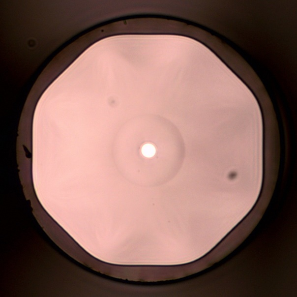 雙包層技術(shù)最早由Snitzer等人[6]提出,由于單模光纖纖芯直徑較小,高NA值的泵浦光功率較難有效的耦合到纖芯中,雙包層光纖的特殊結(jié)構(gòu)解決了泵浦光難耦合到單模光纖纖芯內(nèi)的問題,通過泵浦光直接耦合到包層中,顯著提高了耦合效率及泵浦功率。雙包層光纖由纖芯、內(nèi)包層、外包層和涂層組成,其結(jié)構(gòu)示意如圖4。纖芯由摻鐿的SiO2玻璃構(gòu)成,在光纖激光器作為激光介質(zhì),也作為單模激光的波導(dǎo)。內(nèi)包層由純SiO2構(gòu)成,由于其面積和數(shù)值孔徑比纖芯大得多,可有效提高泵浦光的入射面積,因此可采用多個(gè)泵浦源。目前雙包層的內(nèi)包層常規(guī)直徑已達(dá)400μm(邊-邊距離)以上,外包層由低折涂層構(gòu)成。由于高功率激光器運(yùn)行中會產(chǎn)生高溫,部分光纖生產(chǎn)廠家為了提高光纖的穩(wěn)定性,會在內(nèi)包層外面再加一層摻氟層,形成三包層光纖,如圖5所示為典型的三包層摻鐿光纖端面圖。