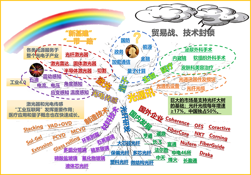 用一棵“光纖大樹”來看看這個(gè)行業(yè)(如圖2)。光纖大樹已經(jīng)發(fā)展了半個(gè)多世紀(jì),光纖的上游領(lǐng)域(樹根部分)主要涉及玻璃、高分子材料、制造技術(shù)等,全球大量的科研院所、企業(yè)依然在這一基礎(chǔ)條件中貢獻(xiàn)著聰明智慧。下游應(yīng)用(樹枝部分)涉及光電通訊、光纖激光、光電傳感、生物醫(yī)療等幾大領(lǐng)域。通信單模光纖的應(yīng)用優(yōu)勢(shì)依然非常明顯(高帶寬、柔性、抗干擾、化學(xué)性質(zhì)穩(wěn)定、性價(jià)比高),且占據(jù)著主要的地位。然而,特種光纖的發(fā)展對(duì)新一代的科技發(fā)展所起到的作用不可小視,它不僅提升了光纖技術(shù)的技術(shù)含量,對(duì)“5G”信息通信行業(yè)新基建發(fā)展起到了支撐和促進(jìn)作用,還對(duì)大環(huán)境(彩虹和烏云)“一帶一路”國際光纜干線戰(zhàn)略的建設(shè),突破貿(mào)易戰(zhàn)中的技術(shù)壁壘,都具有重要的作用。